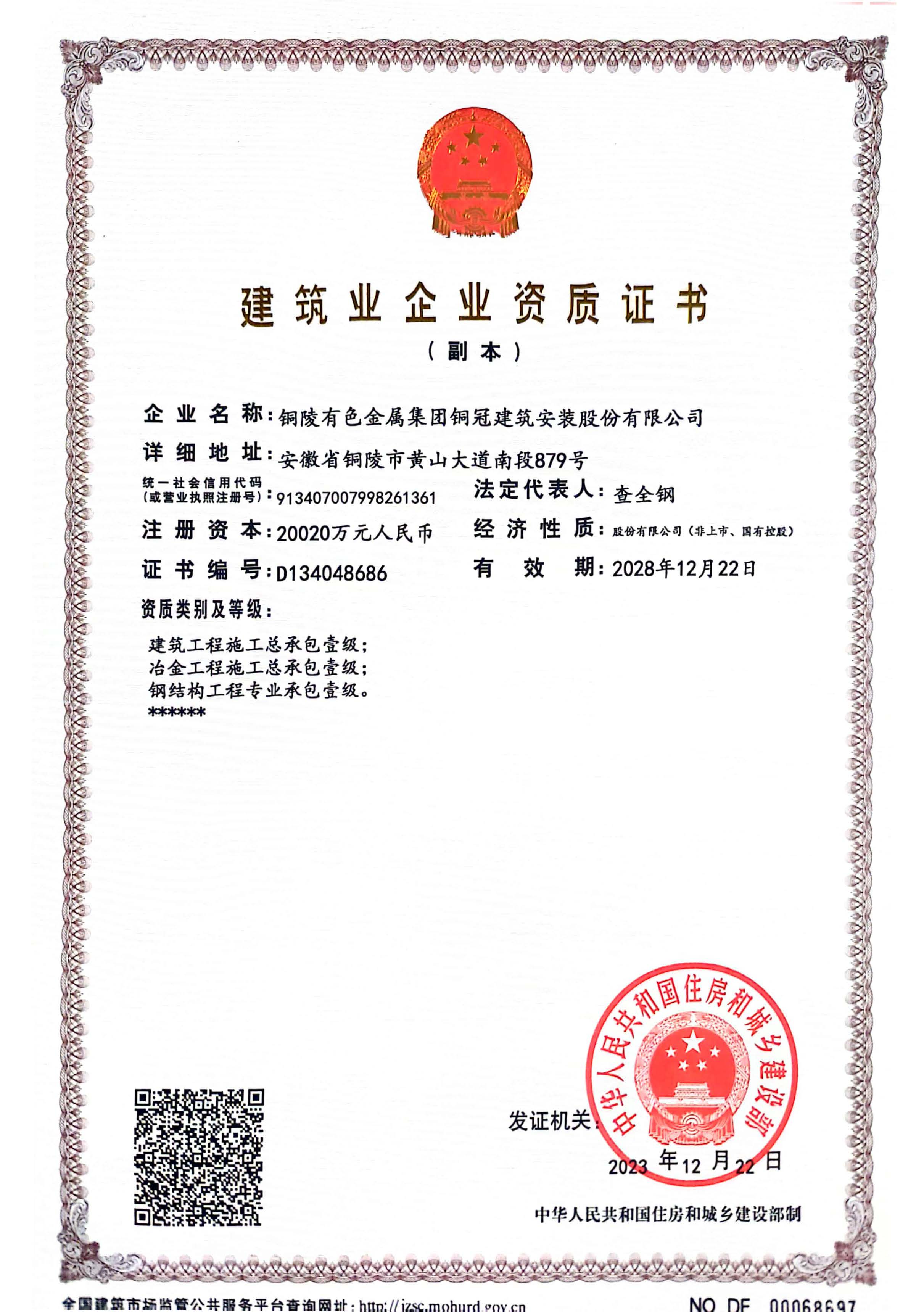 • 有色金屬工業(yè)建設(shè)工程質(zhì)量檢測(cè)機(jī)構(gòu)資質(zhì)證書(shū)
